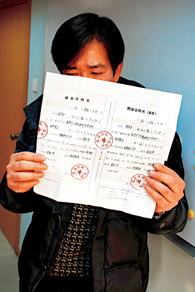 圖:港籍刑滿釋放人員彭姓男子手持釋放證明書到香港工聯會深圳中心求助 本報攝