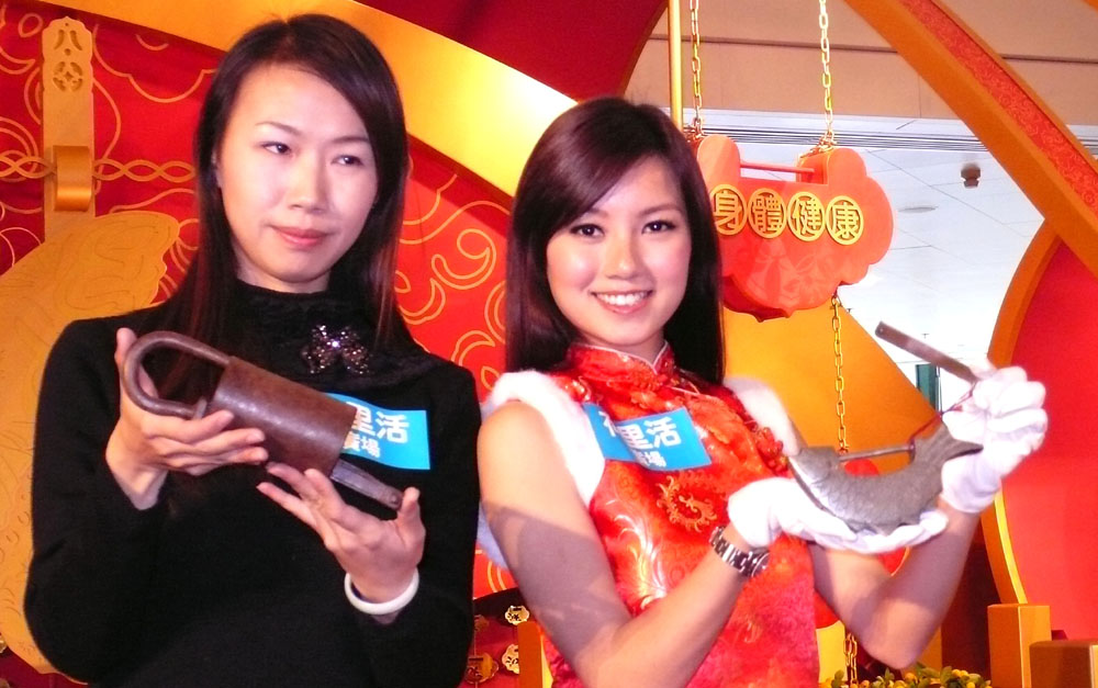 圖:尹翠華(左)手上拿着的桶鎖,重約一公斤,用作「守護」以前糧倉;模特兒手上則是魚鎖 本報攝