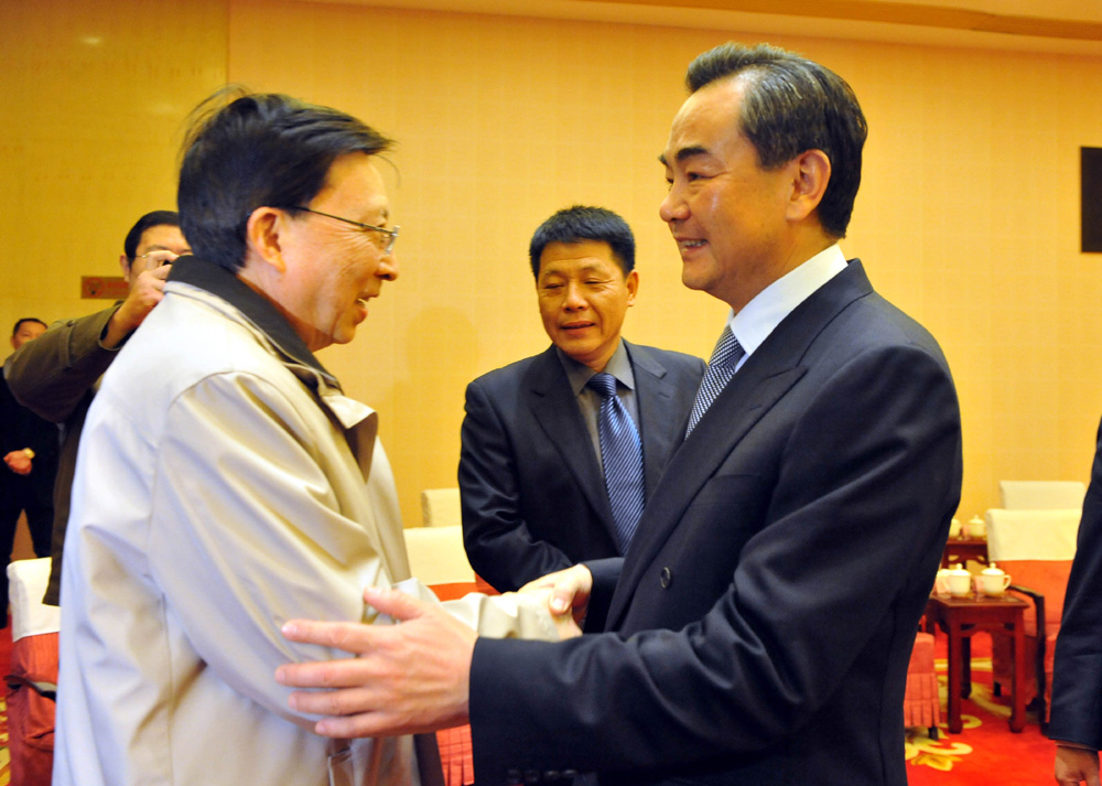 圖:國台辦主任王毅(右)18日在第九屆兩岸關係研討會與台灣中華文化總會會長劉兆玄交談 新華社