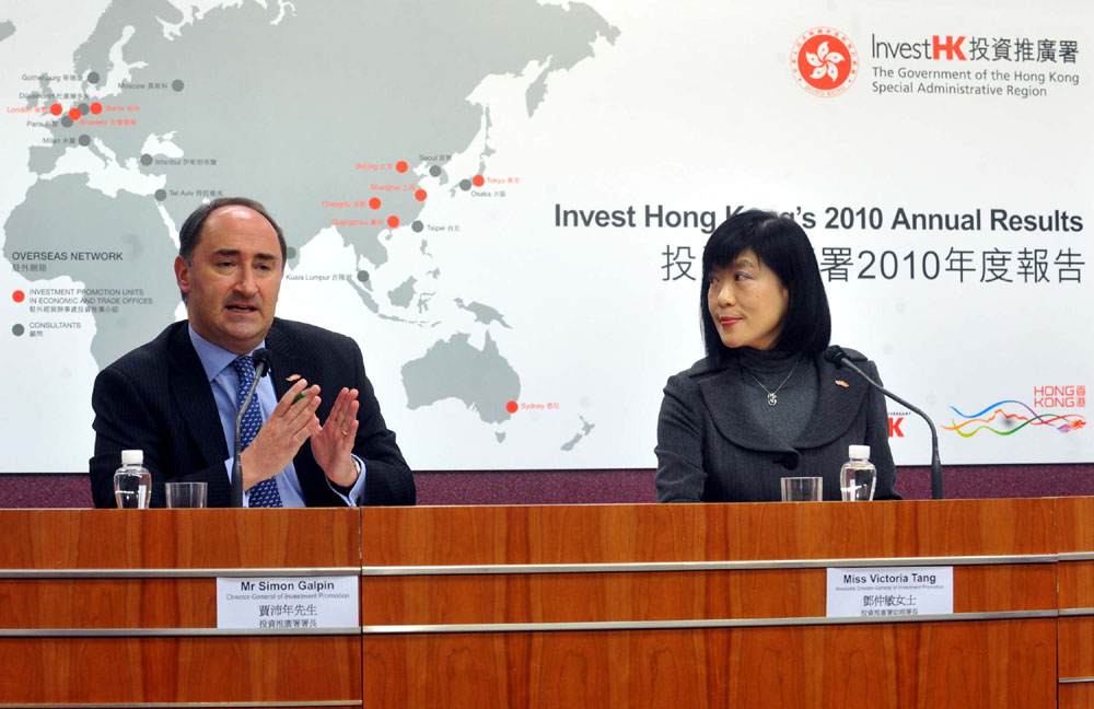 圖:投資推廣署署長賈沛年(左)昨日公布該署在二○一○年度的投資推廣成果 中通社