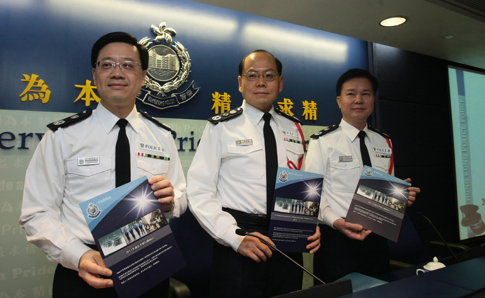 圖:「一哥」曾偉雄(中)表示,本港去年整體的治安情況平穩,旁為李家超(左)和鄧甘滿(右) 黃洋港攝