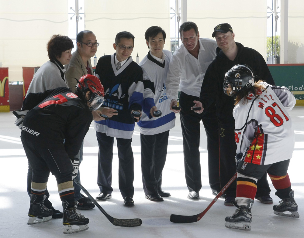 圖:香港業餘冰球會及香港冰球訓練學校主席胡文新(後排左三)等,主持聯賽開球禮\本報攝