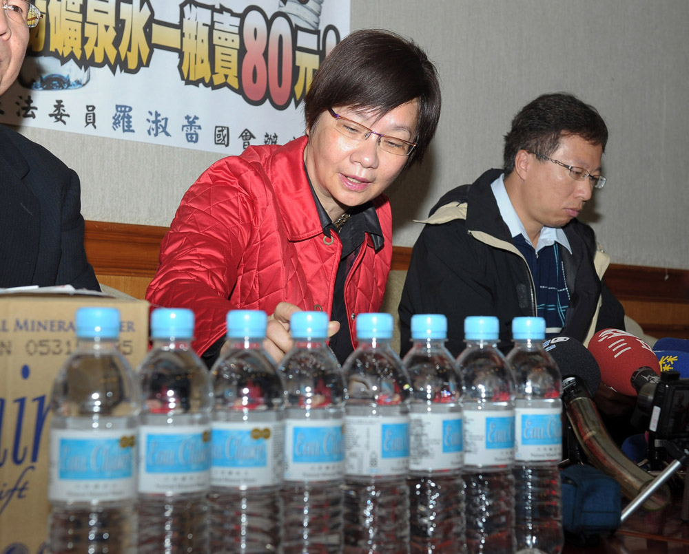 國民黨立委羅淑蕾(左)10日召開記者會,指桃園機場管制區內一款馬來西亞品牌的進口礦泉水,每瓶要價高達新台幣80元,把民眾當凱子削。