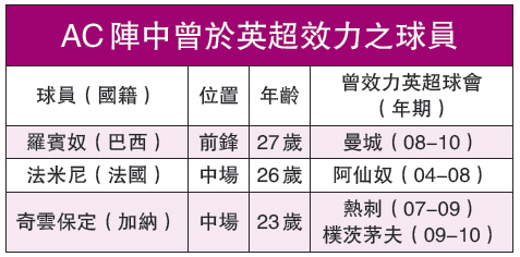 「紅黑軍團」AC米蘭陣中有幾位曾於英超效力的球員,包括鋒將羅賓奴、中場法米尼及奇雲保定,說不定此戰可「以英制英」壓住熱刺。