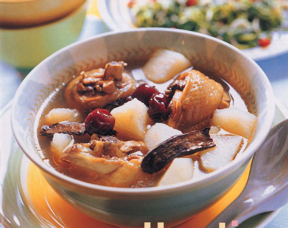 材料:丹參9克 紅棗6粒 雞腿500克 新鮮淮山200克