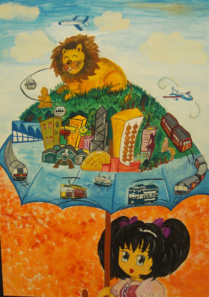 一曲《獅子山下》讓港人唱出同舟共濟的心聲。獅子山從此也成為香港的象徵。圖中的小女孩撐着一把傘,「撐」這個字在廣東話裡也有支持的意思。傘上面的獅子代表了獅子山,獅子腳下的城自然就是香港。畫中的小女孩代表了作者自己,表達對香港的無限支持。