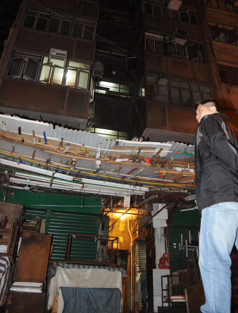 昨日凌晨四時許,事主走到上址天台欲跳樓自殺,但因畏高心理臨陣退縮,順層而下去到四樓,不再心驚肉跳便膽識大壯,於是縱身躍下,不過跌落約二樓高的排檔帳篷,再反彈落馬路臥地不起。救護員接報趕到急救時,青年不斷自言自語「只係撞親塊面」、「天台我唔夠膽,太高啦。」令救護員不勝其擾,送院檢查證實無傷。