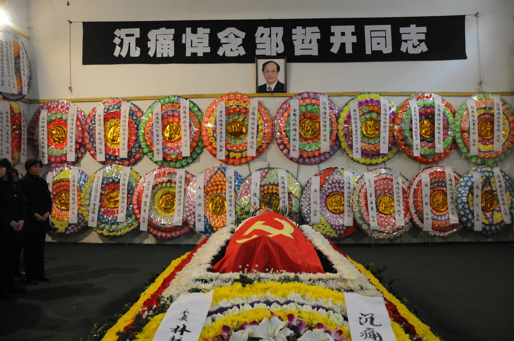 在舉行遺體告別儀式的大廳內,四周都掛滿了兩岸三地相關部門、機構和各界人士送來的數百個花圈。鄒哲開的遺體靜臥於靈台上,上面覆蓋着一面中國共產黨黨旗,四周擺放着白、紅、黃三層菊花。在沉重的哀樂聲中,參加悼念的五百多人一一向鄒哲開的遺體鞠躬,做最後的告別。