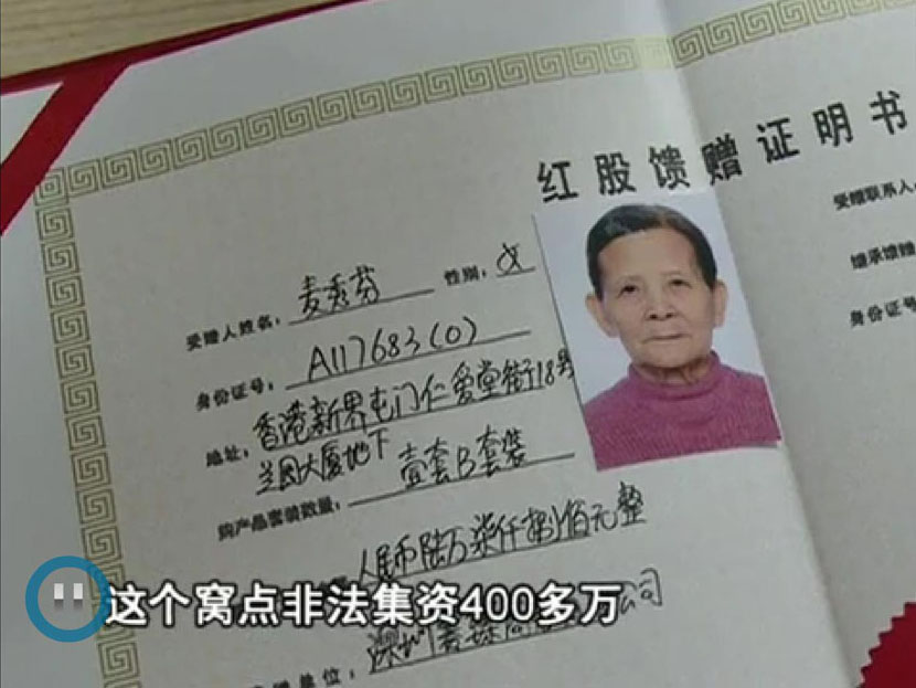 據深圳警方透露,受騙以深港兩地老人為主,而且香港人居多,造騙出資在內地合股建廠。其中,投資最多的是香港人麥先生,金額高達一百五十萬元人民幣。而另一位姓麥的香港老婦已經七十三歲高齡,居住香港新界屯門,出資金額為六萬七千九百元,饋贈日期長達二十七年。據現場警員稱,麥姓老婦居住香港底層社區,遭騙資金屬於其老年積蓄。