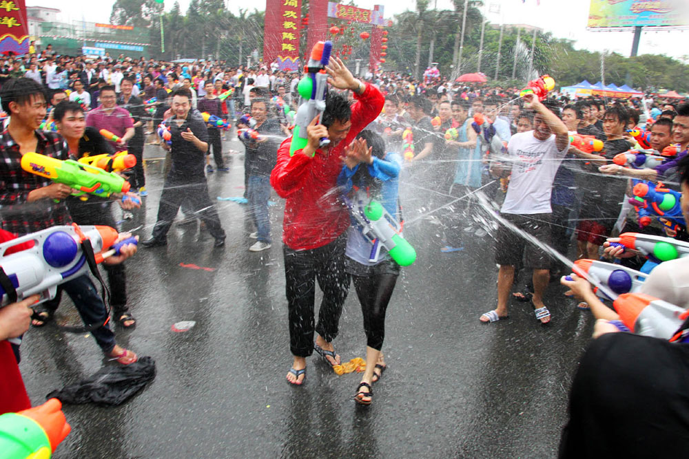 已有400多年歷史的廣東東莞東坑鎮二月初二「賣身節」6日開鑼,開幕式上本土農耕文化與西域邊陲風情連袂登台。記者現場見到,因好玩刺激而又能預兆開年好運,當地數十萬人湧上街頭用玩具水槍射水作樂,希望能在這一天讓水灑一身吉祥,場面十分壯觀。