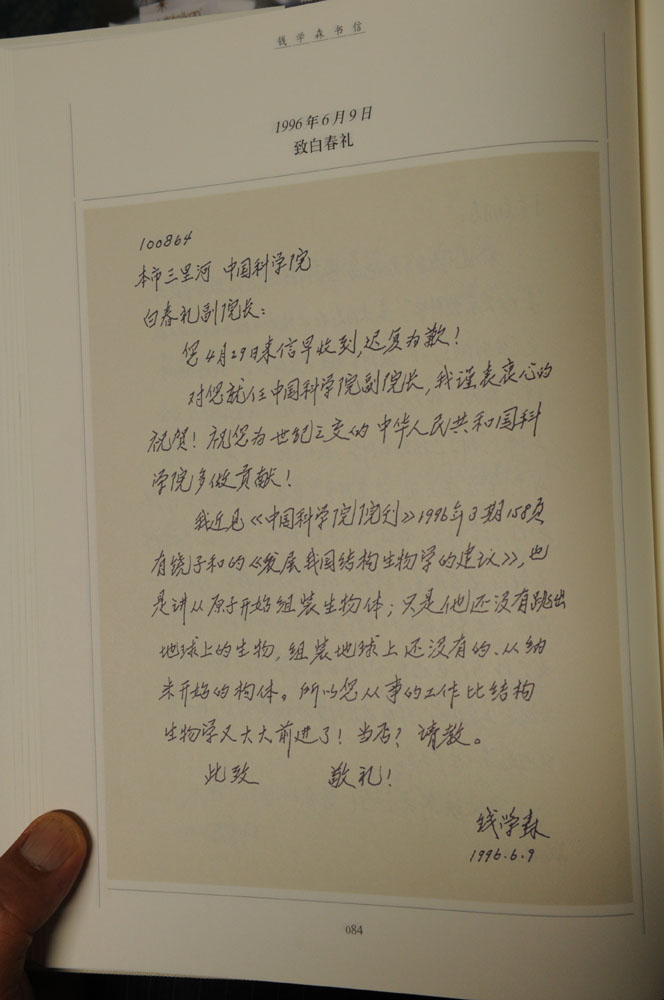 在白春禮的辦公室,靠近門口附近有座大書櫃。他從書櫃中找出一本厚厚的乳白色書皮的精裝本,名為《錢學森書信》。「第85頁是錢老在1996年4月21日致給我的一封親筆信。」