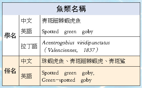 「每周一魚」今期是第84周,「香港魚類學會」繼續給讀者精心介紹在香港棲息的所有野生魚類,是次所介紹的物種為「青斑細棘蝦虎魚(Acentrogobius viridipunctatus)」。隸屬「鱸形目(Perciformes)」下「蝦虎魚科(Gobiidae)」,魚類進化中為一群較進步的小型底棲魚類,主要分布熱帶至涼溫帶的沿岸河川下游、陸棚至珊瑚礁淺海,某些種終生棲息於淡水。(欲閱前文,可到「大公網」或參閱本會「每周一魚」目錄)。