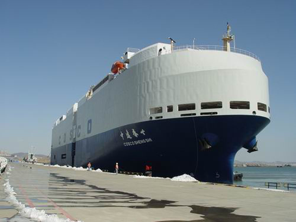 【本報記者劉德田、實習記者王瑋、通訊員于海青大連十一日電】近日,中國自主設計製造的汽車滾裝船「中遠盛世」號輪首次掛靠大連港汽車碼頭,並裝載160輛華晨汽車出口至巴西。這標誌着汽車出口運輸告別過去一直依賴於國外船舶運輸的歷史。「中遠盛世」輪今年2月中旬正式交付使用。該系列船舶由2艘同類型的5000車位汽車滾裝船組成。該船舶設計航速20節,總長182.8米,型寬32.2米,型深14.95米,載重量約14500噸。它具有三層可調甲板,可滿足不同高度車輛的運輸需求,每次可承運5000輛。
