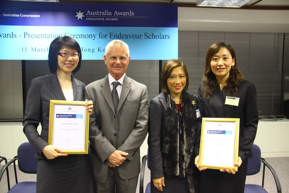 澳洲駐港領事館昨晚舉行二○一一年度「長江澳洲毅進獎學金」頒獎禮,香港理大的博士畢業生魏佩菁和陳淑貞獲得「長江澳洲研究毅進獎學金」,將分別赴澳洲悉尼大學和新南威爾士大學從事學術研究。作為物理治療師,魏佩菁選擇的研究方向是慢性肺病的治療。陳淑貞將專注研究學術領域的英語應用。她們同稱,澳洲在語言教育和物理治療等研究方面,在世界上處領先地位。獲頒獎學金,能使自己有機會赴澳,一圓心願。由○七年到去年,本港有四批、共十六名博士畢業生獲此獎學金到澳洲深造。