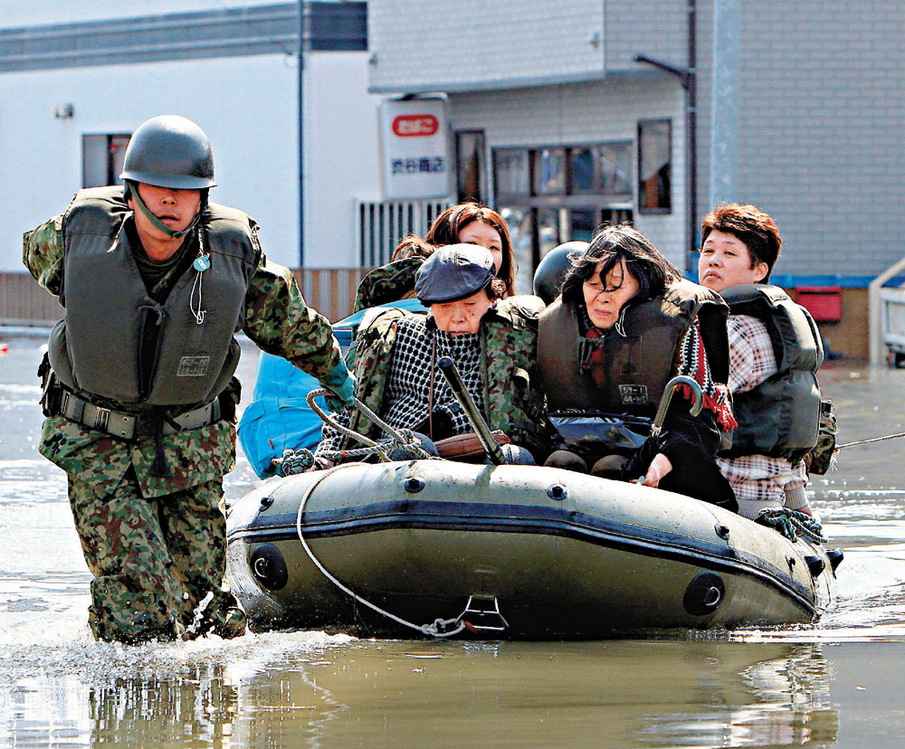 圖:日本自衛隊一名士兵13日將宮城縣的受困人員撤離\法新社