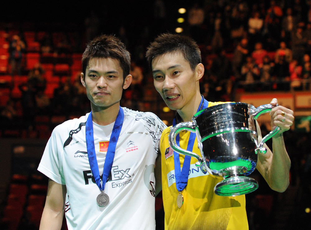 圖:林丹(左)不敵馬來西亞的李宗偉(右),未能第五度染指全英賽男單錦標」新華社