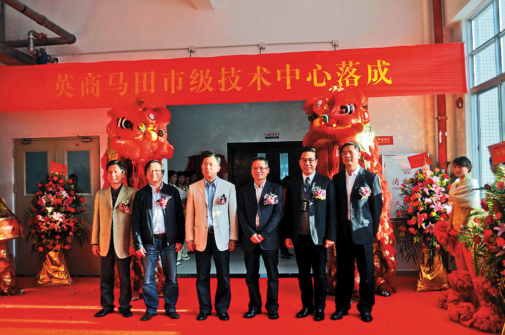 圖:晶苑旗下英商馬田技術中心於日前正式落成,板芙鎮黨委書記杜琪敏(左三)和集團董事王志輝(左二)等嘉賓到賀
