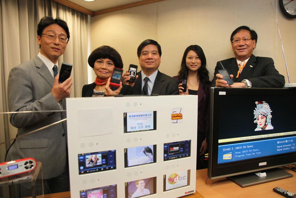 圖:(左起)影視及娛樂事務管理處處長劉明光、新城廣播有限公司董事總經理馬健生、商務及經濟發展局副秘書長(通訊及科技)蕭如彬、鳳凰廣播總裁助理于盈、香港數碼廣播有限公司主席鄭經翰公布有關數碼聲音廣播的安排
