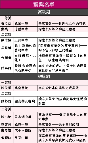 配合辛亥革命百周年,「第二屆全港中學中國歷史研習獎勵計劃」以探索辛亥革命的歷史意義為主題,鼓勵每名參賽的中學生自設分題,撰寫一篇一千(初中生)至千五字(高中生)的文章。大會近日頒獎,風采中學的蔡汶蒑和培僑中學的戴樂並列高中組一等獎,初中組一等獎為英皇書院的陳俊榮。(見附表)