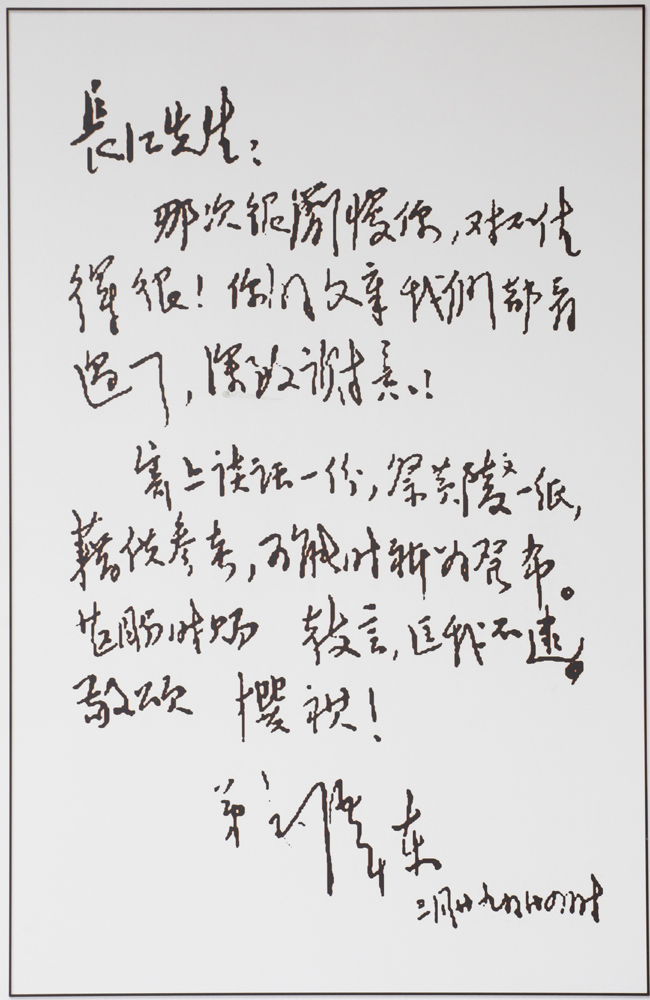 圖:毛澤東致范長江信:「長江先生:那次很簡慢你,對不住得很!你的文章我們都看過了,深致謝意!寄上談話一份,祭黃陵文一紙,藉供參考,可能時祈為發布。甚盼時賜教言,匡我不逮。敬頌撰祺!弟毛澤東三月廿九日廿四時」\本報資料室