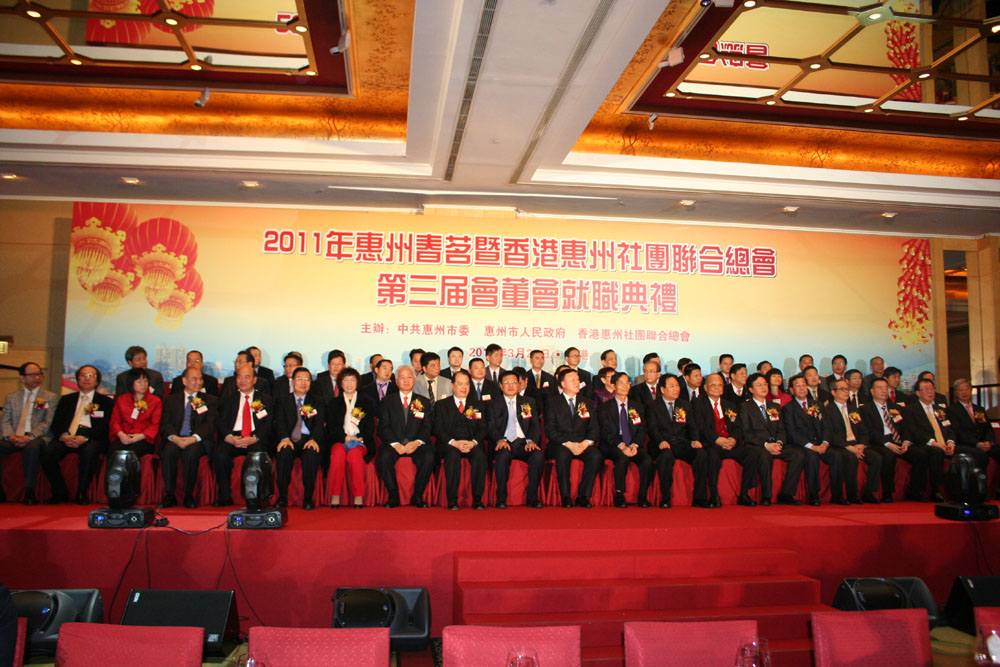 日前,惠州市委市政府和香港惠州社團聯合總會聯合假尖沙咀洲際酒店隆重舉行「2011年惠州春茗暨香港惠州社團聯合總會第3屆會董會就職典禮」。應邀出席擔任主禮嘉賓的有廣東省委常委、副省長肖志恆,中聯辦副主任黎桂康,外交部駐港副特派員李元明,勞工及福利局局長張建宗,惠州市委副書記、市長李汝求等兩地政要出席主禮。全國政協委員、旭日集團主席楊釗在全場的見證下,榮膺惠州社團聯合總會主席,承諾繼續發揮橋樑作用,推動兩地經貿發展和交流合作。