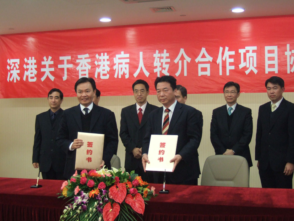 三十日下午,深圳市衛生和人口計劃生育委員會與香港醫管局的代表在深圳舉行簽約儀式,簽署為期五年的合作協議。深圳市代表包括深圳市衛生和人口計劃生育委員會主任江捍平及副主任許四虎等,香港醫管局的代表包括主席胡定旭、行政總裁梁栢賢和新界東醫院聯網總監馮康等。