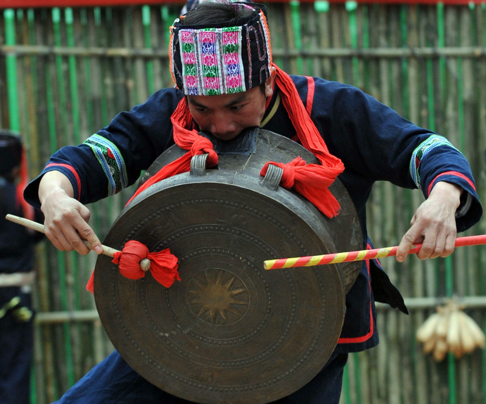廣西東蘭縣三弄瑤族鄉積極開發旅遊資源。圖為當地一名布努瑤男子以特色民俗銅鼓叼敲舞迎賓客。