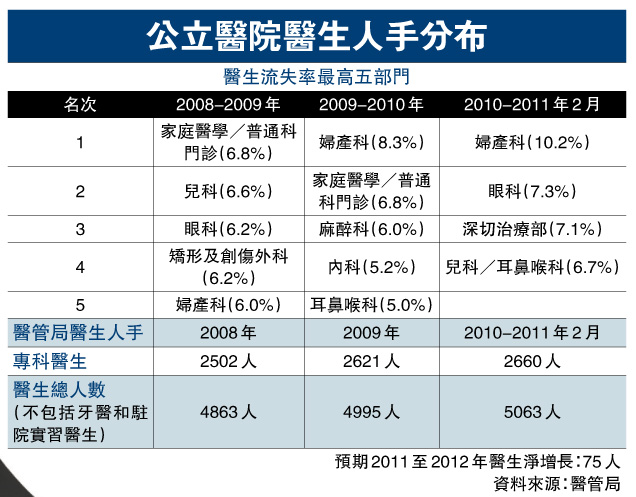 醫管局向立法會提交有關當局醫生流失的文件。整體流失率方面,一○年至今年二月,流失率是百分之五點三,與○七、○八年相若,但較○九年的百分之四點三,多一個百分點。過往,家庭醫生或普通科門診醫生的流失率最高,○九年起,婦產科醫生進佔流失率第一位,有百分之八點三,去年更增至百分之十點二,較整體流失率的百分之五點三,高五個百分點。