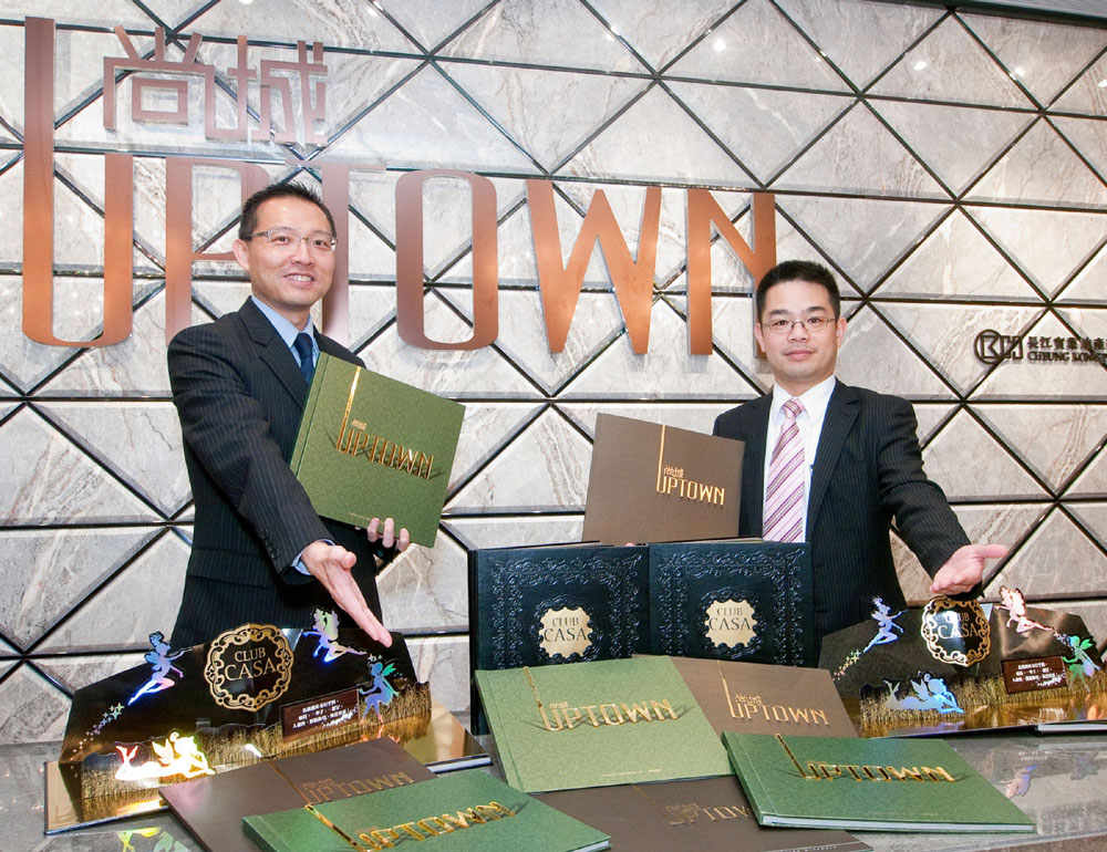 圖:尚城昨派樓書,郭子威(左)強調下周必開價,旁為營業主任黃志強