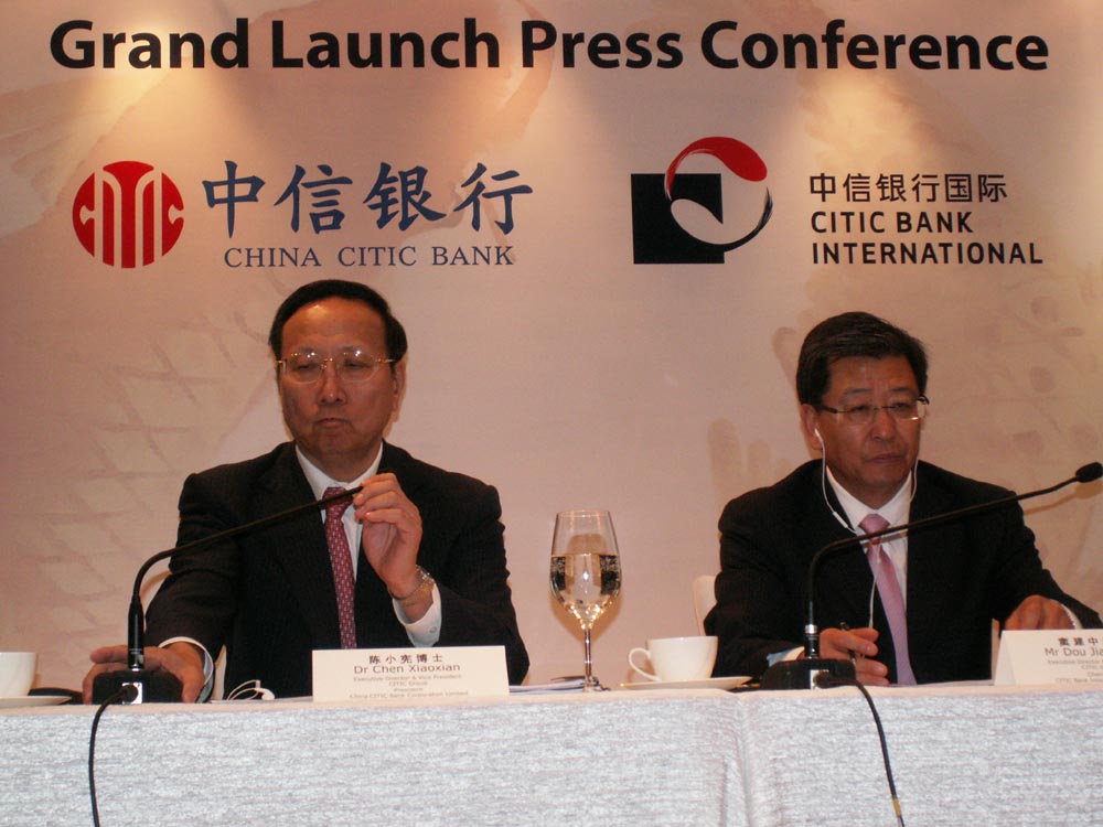 圖:中信銀行行長陳小憲(左)承諾完成供股後肯定派息。旁為中信銀行國際董事長竇建中\本報攝