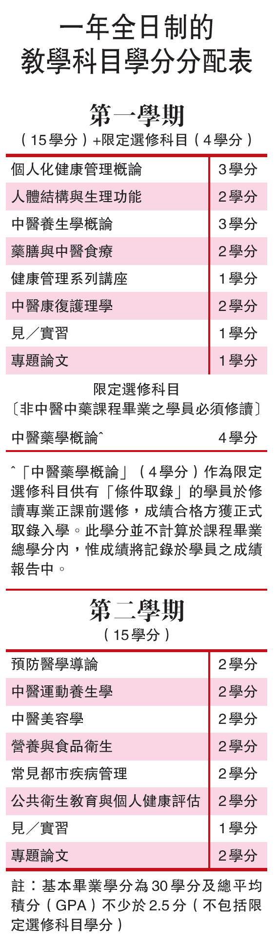 從下表可以看出,學習的科目不僅有「中醫養生學概論」、「藥膳與中醫食療」、「中醫美容學」、「中醫康復護理學」、「常見都市疾病管理」等,還有現代醫學內容,如「個人化健康管理概論」、「預防醫學導論」、「公共衛生教育與個人健康評估」、「營養與食品衛生」等。顯然,在一年全日或兩年兼讀的時間中,學生所要學習的知識是非常多的。以一年全日制的教學科目為例(見圖)