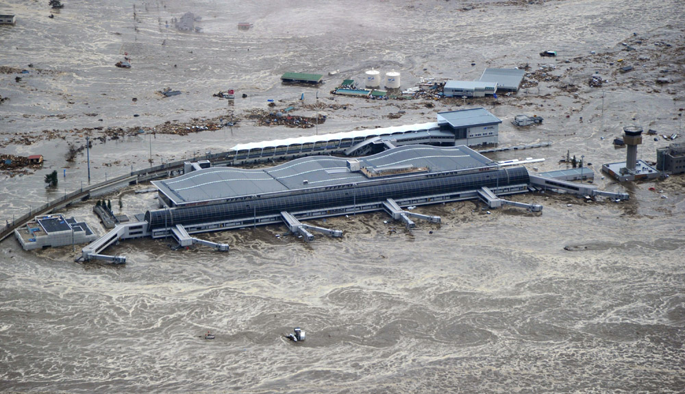 圖:在3月11日幾乎被海嘯完全淹沒的仙台機場,13日方才局部恢復商務航班\美聯社