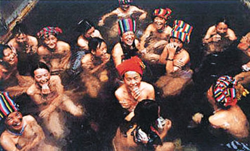 用餐只是洗溫泉的前奏。酒足飯飽之後,阿依留下準備晚飯,其他人的都去溫泉沐浴。男人們大都不露聲色地脫去衣褲,走進溫泉水塘。女人們不像男人那樣瀟灑。她們通常先在水邊脫去上衣,然後一邊走入水中,一邊把裙子往上提,動作緩慢而優雅,直到美麗的身影淹沒在水中……男女青年一邊互相擦背,一邊開着玩笑。在溫泉水中,人們從不會產生佔有的「邪念」。
