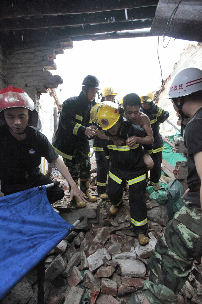 圖:17日,廣東省佛山市順德區遭遇短時強降水和大風天氣。一座民房被大風吹倒,救護人員救出傷者 新華社