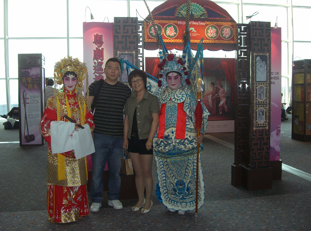 「粵劇舞台美術」設在一號客運大樓離境大堂鄰近三十五號登機閘口,展出色彩奪目的粵劇傳統戲服、盔頭、靴鞋及道具等舞台用品,當中有鳳凰女演出《鳳閣恩仇未了情》飾演南宋紅鸞郡主時所穿戲服的複製品;還有四十至五十年代著名花旦秦小梨演出時佩戴的綠石頭飾。而設於鄰近三十六號登機閘口的「粵劇巡禮」,則圖文並茂介紹粵劇幕後製作,兩個展覽互相呼應。