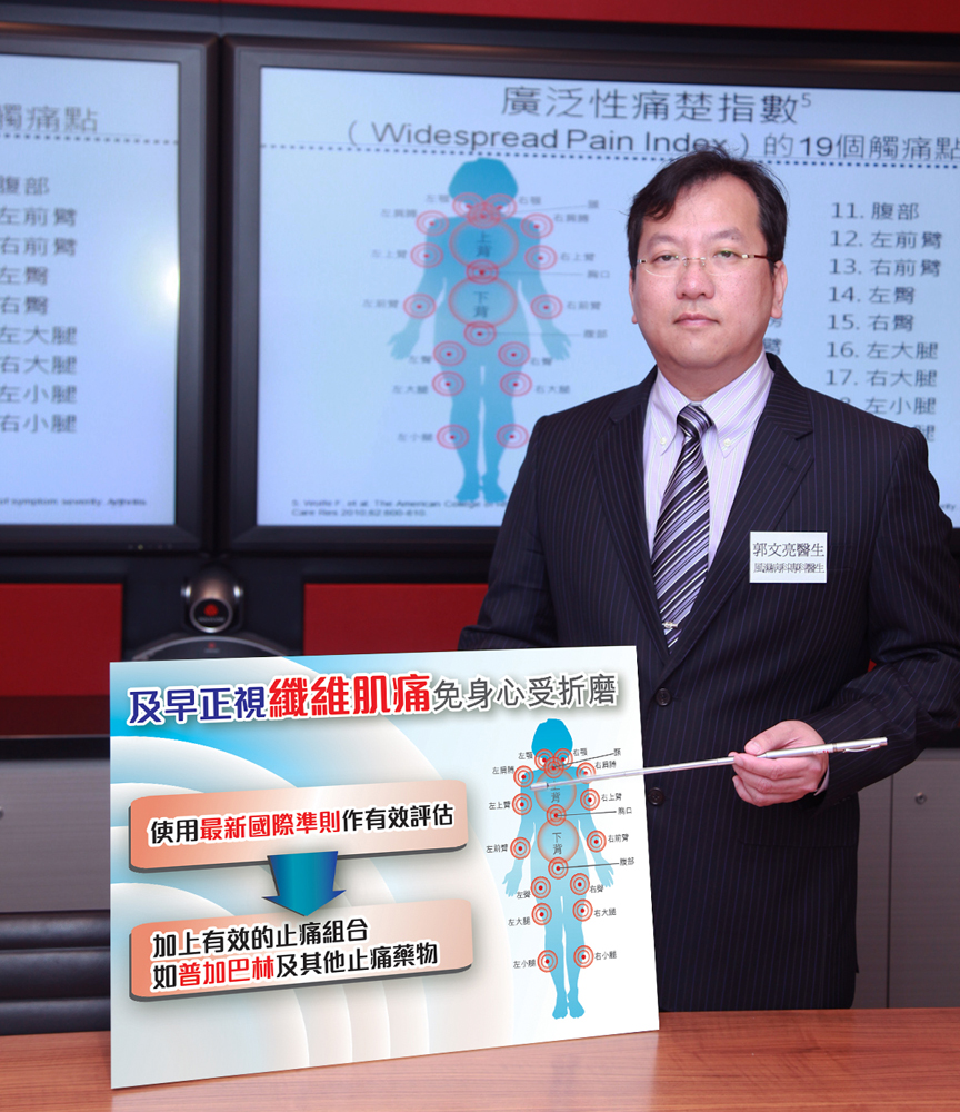 風濕病科專科醫生郭文亮說,纖維肌痛屬風濕性症候群,患者普遍出現三個月以上慢性和彌散性的疼痛,非機械性痛症或炎症,有刀刺及火灼感覺,同時伴有頭暈、失眠甚至肌肉僵硬,表面無紅腫,徵狀與其他痛症相似。纖維肌痛對病人情緒造成影響,約四成患者有不同程度抑鬱症,四成半有焦慮症。