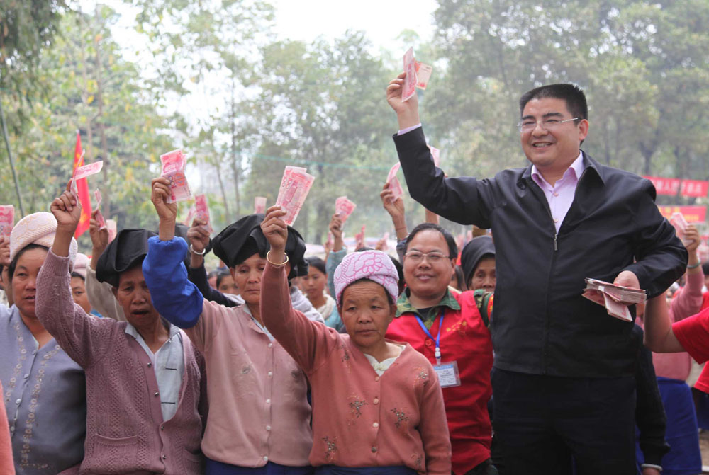 圖:陳光標向「3·10」雲南盈江地震受災群眾發慰問金\中新社