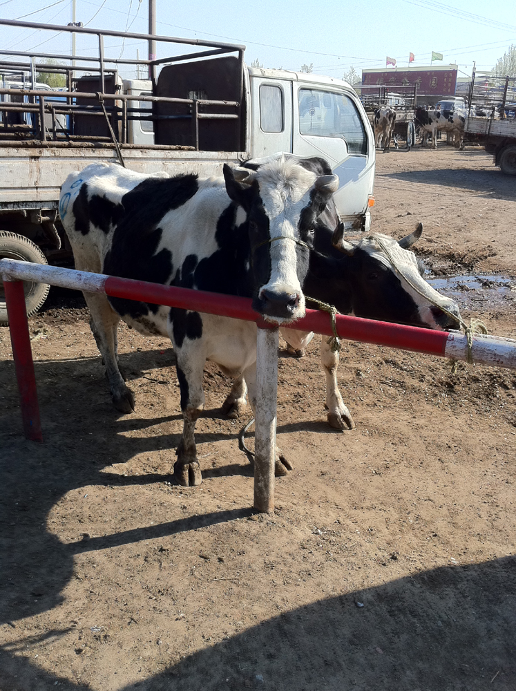 圖:位於河北稿城與無極交界處的活牛交易集市,來自內蒙、山西、河北、山東等地的活牛聚集在此,進行交易。圖為兩頭供人選購的活牛\本報攝