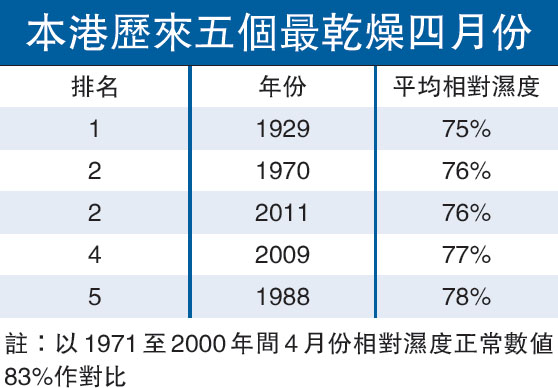 天文台總學術主任李健威昨日接受本報查詢時表示,根據天文台自一八八四年起的相對濕度紀錄,歷來最乾燥的四月份在一九二九年,當時錄得的平均相對濕度為百分之七十五,上月份錄得的平均相對濕度為百分之七十六,較正常數值的百分之八十三為低,是四十一年以來最乾燥的四月份,與一九七○年四月錄得的相同,並列歷來第二最乾燥的四月份。