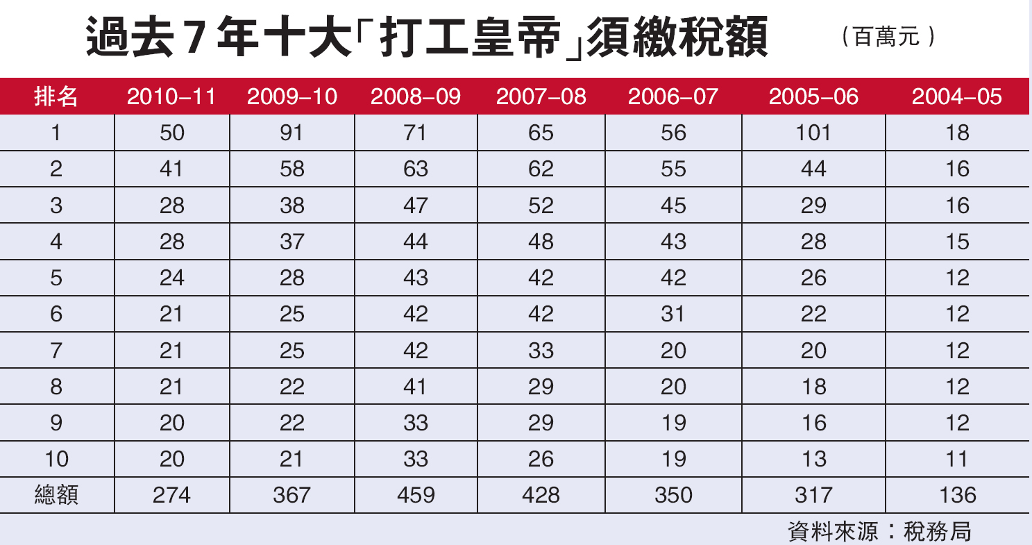 稅務局公布一○至一一年度首十名繳交薪俸稅最多的納稅人名單,榮膺「打工皇中皇」需繳交五千萬元稅額,較○九至一○年度的九千一百萬元,大幅「縮水」四成五,是自○四至○五年以來新低。以現時薪俸稅標準稅率百分之十五計算,估計「打工皇中皇」其全年收入有三點三三億元,平均月薪達二千七百多萬元,較○九至一○年度的「打工皇中皇」全年收入達六點零六億元,平均月薪逾五千萬元,「打工皇中皇」收入「縮水」近半。