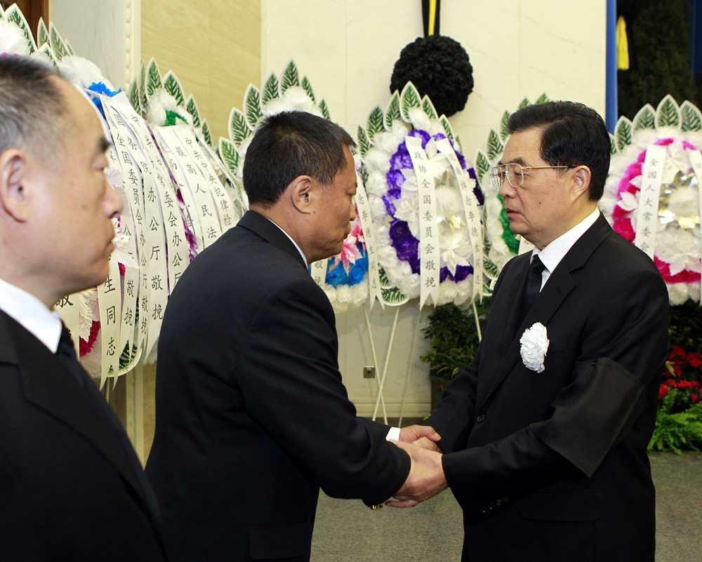 圖:李德生遺體14日在北京八寶山革命公墓火化。胡錦濤、吳邦國、溫家寶、賈慶林、李長春、習近平、李克強、賀國強、周永康等前往送別。圖為胡錦濤與李德生親屬握手,表示深切慰問 新華社
