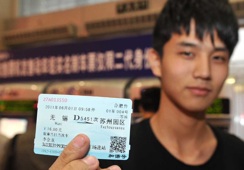 圖:22日,在合肥火車站售票廳,一名旅客在展示剛剛購買的實名動車車票 新華社