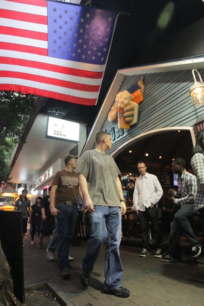 【本報訊】每次美軍抵港,中環蘭桂坊和灣仔駱克道的酒吧都其門如市。有酒吧預計生意可增加五成,單單未來幾日已準備過千公斤冰粒給美軍飲酒之用。面對數千美軍官兵湧港,灣仔街頭「群鶯亂舞」,站在酒吧前招客。有水兵承認香港之行想識香港女士,但嫌駱克道的女士太進取,對他們又搣又推。