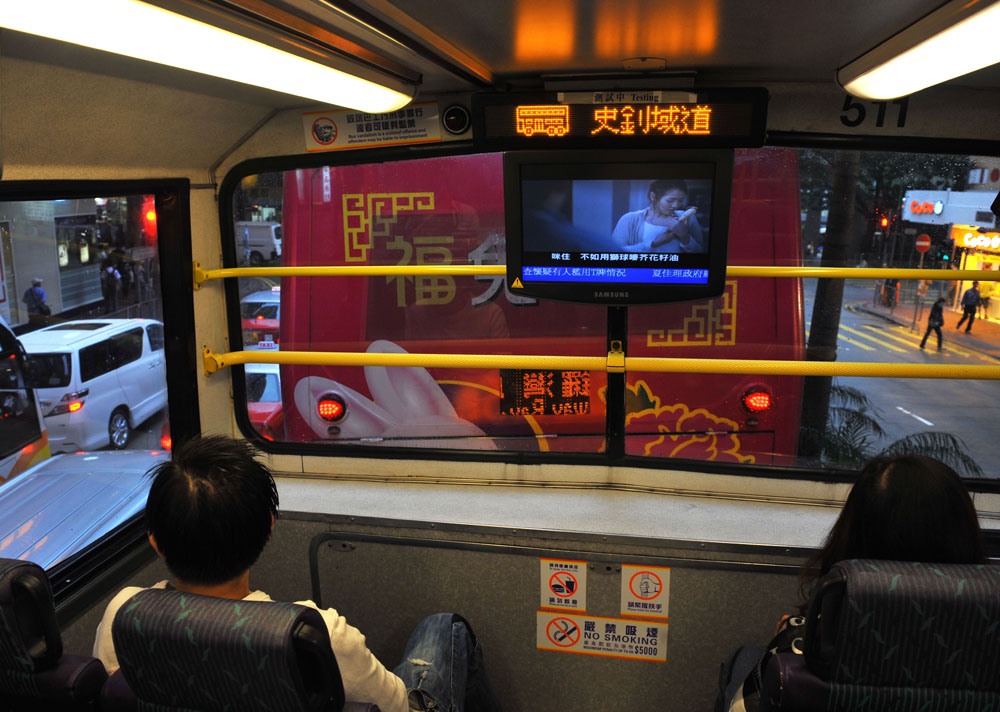 新巴及城巴發言人表示,城巴已於去年中開始,先為行駛港島及過海的巴士路線,安裝採用全球衛星定位技術的「自動報站系統」(上圖),至今已有約七百部完成安裝工程,佔整體城巴數目近九成。發言人稱,將於下月底前,完成餘下城巴的安裝工程,屆時全線城巴都配備系統。