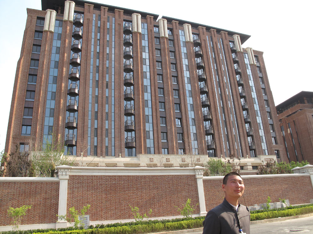 今日下午記者按圖索驥,來到玉淵潭公園北門,沿着一條小路直走到盡頭,映入眼簾的便是四棟紅牆白瓦的中式建築,在玉淵潭湖岸由西向東一字排開,寧靜隱逸。一位身着中山裝的保安攔下記者,當記者以求購者身份欲進入小區時,該保安制止道:「沒有預約的顧客一律不准入內。」。記者看到,在小區門口一座中國傳統式大門上掛着金燦燦的牌匾,上面寫着「七號院」。