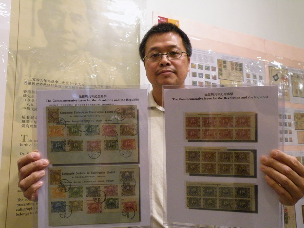 圖:集郵逾二十年的郵票收藏家吳貴龍展示光復共和紀念郵票