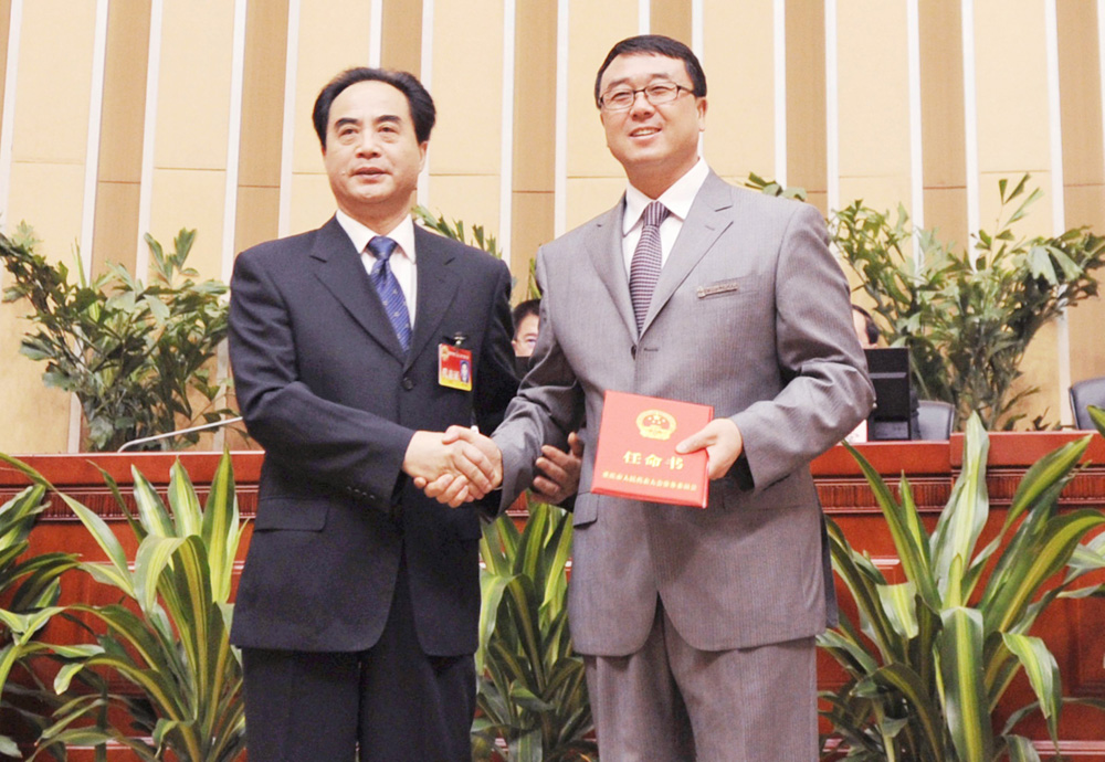 圖:二十七日,在重慶市三屆人大常委會第二十四次會議上,重慶市公安局局長王立軍滿票獲任重慶市副市長。圖為王立軍(右)從重慶市人大常委會主任陳光國手中接過聘書中新社