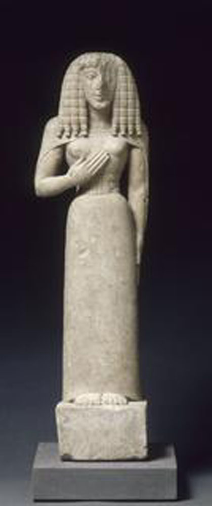 這尊高七十五厘米的《奧塞爾女郎》雕像,她的真實身份仍讓人百思不得其解:她是一位女神?是侍奉天神的女僕?還是一個普通人?無論如何,這尊雕像是古希臘藝術最早的石雕之一。她在約公元前七世紀末三十年,於克里特島製作而成。雕像在十九世紀末被重新發現,在法國中部城市奧塞爾(Auxerre)舉行的拍賣會上競拍,因此而得名《奧塞爾女郎》。
