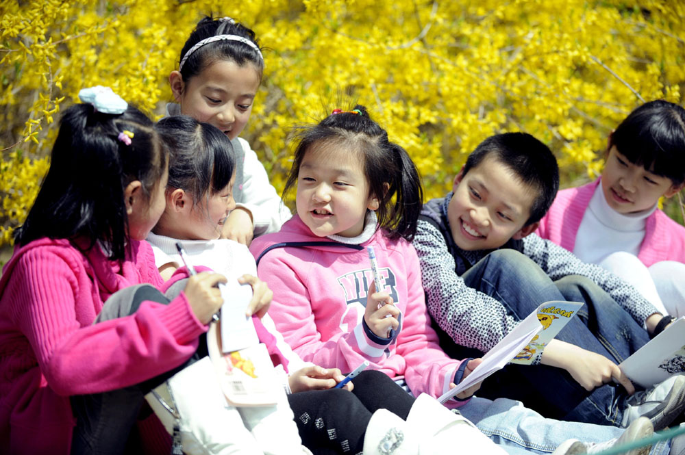 圖:瀋陽市團結路小學組織「公園課堂」主題活動,讓三個年級的學生走出校門,親近大自然,圖為一名學生給同學們講故事\新華社