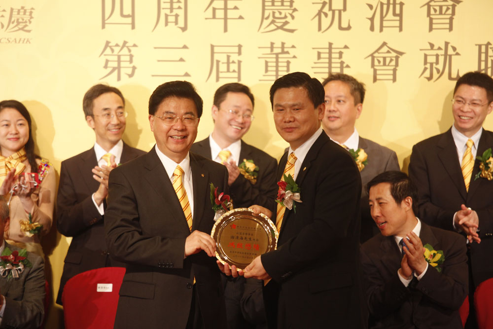香港中資證券業協會昨日舉行成立四周年慶祝酒會暨第三屆董事會就職典禮。國泰君安執行總裁閻峰(右)成為新一任會長,中銀國際副執行總裁謝湧海(左)則榮升為永遠名譽會長。香港中資證券業協會於2007年成立,到2009年正式註冊為協會,會員人數由初創時只有8家會員,到現時已發展到32家。